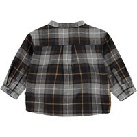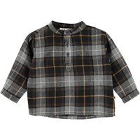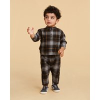 Enoz is a plaid baby shirt. It has buttons at the collar. There are baby trousers that match this shirt. perfectly.