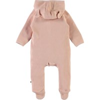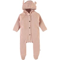 Faith is a rose coloured baby romper in a waffle knit cotton. The romper has a snap front closure and a hoodie with small, sewn on ears.
