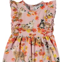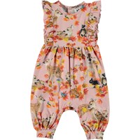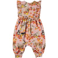 Fallon is a sleeveless baby romper with a ruffle edge on the shoulders. It is in pink with a print of deer, rabbits and golden leaves. Fallon has easy snap closure at the neck and at the crotch.