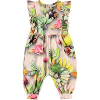 Fallon is a baby suit with long legs with an all-over fruit print. The suit has ruffle edges at the armholes and an easy snap closure at the neck and crotch.