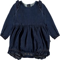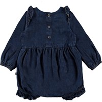 Fawn is a baby bodysuit in dark blue denim with long sleeves and without legs. It has a small ruffle edge on the shoulders and at the legs. It has easy snap closure at the neck and crotch.