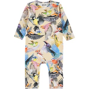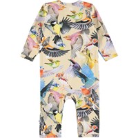 Fenez is a baby bodysuit with long sleeves and legs. The bodysuit in a light yellow with a bird print. It has an easy snap closure at the neck and between the legs.