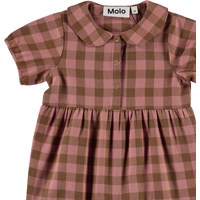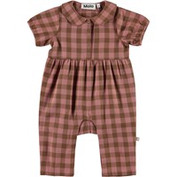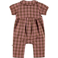 Fernanda is a plaid baby romper in pink and brown with short sleeves and long legs. It has a snap closure on the front and has a small collar.