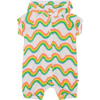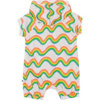 White romper with hood in soft, organic cotton. The romper has short sleeves and legs, raglan sleeves and a front button closure. It has rib at the sleeves, legs and hood edge. It has an easy snap closure between the legs. The romper is in a colourful, all over print of Molo's iconic rainbow.