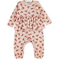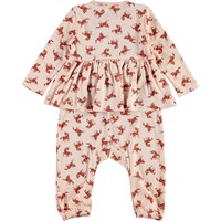 Flavia is a pink baby romper with a print of small horses. It has long sleeves and legs with a peplum skirt. It has easy snap closure on the shoulders and at the crotch.