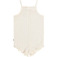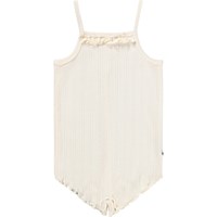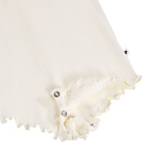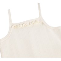 White bodysuit for thel little ones made of organic cotton pointelle with straps. It has babylock edges and a ruffle at the neck. Easy to fasten with snap buttons on the shoulders and between the legs.