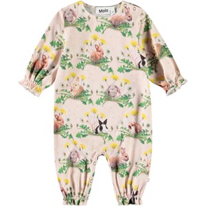 Jumpsuit for the little ones made from organic cotton. The jumpsuit is loose-fitting with long sleeves and legs. There is elastic at the wrists and ankles, adding a small ruffle edge. The button fastening on one shoulder and between the legs makes it easy to put on and take off. The jumpsuit features an all-over print of animal babies in a flowerbed.