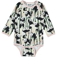 Fonda is a long sleeve baby bodysuit with a print of pandas and their favourite food: bamboo. Fonda has pink edge tape and an easy snap closure at the collar and crotch.