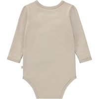 Beige baby bodysuit with a print of a peace sign in flowers. This bodysuit is in 100% cotton, has long sleeves and easy snap closure at the neck and between the legs. Wear the bodysuit with the Seb pull on trousers in the same print.