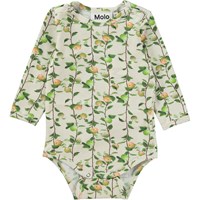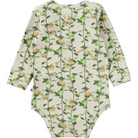 Foss is a cream and green baby bodysuit with long sleeves in 100% organic cotton jersey. Foss has an easy snap closure at the neck and between the legs. It is in the Apples Mini all over print, which has a lot of apple tree branches filled with apples.