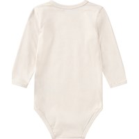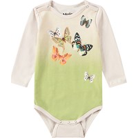 Off-white long-sleeved baby bodysuit made from organic cotton. The bodysuit has poppers at the collar and between the legs, making it easy to take off and put on and features a print of colourful butterflies flying on a green background.