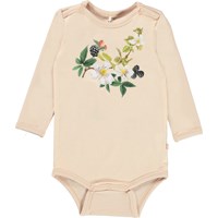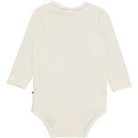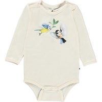 Foss is a light coloured baby bodysuit with a print of small birds on the front. Foss has easy snap closure at the neck and between the legs.