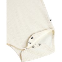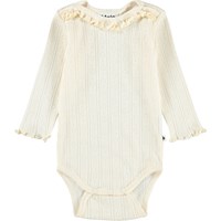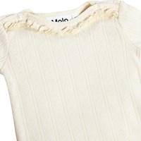 Long-sleeved bodysuit for the little ones made of white organic cotton pointelle. It has babylock edging at the sleeves, ruffle detail at the neckline, and snap buttons on the shoulders and between the legs for easy dressing and undressing.