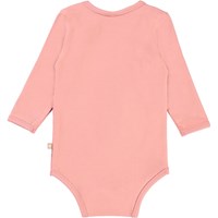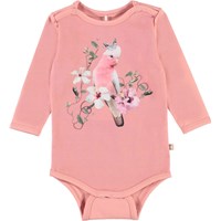 Foss is a long sleeve, coral coloured baby bodysuit with a print of a parrot and a lot of flowers. It has easy snap closures at the neck and between the legs for quick changes.