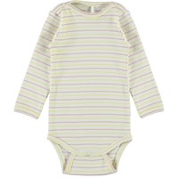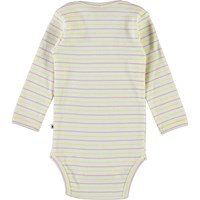 Foss is a long sleeve baby bodysuit with narrow yellow and rose stripes. It has easy snap closure at the neck and crotch.