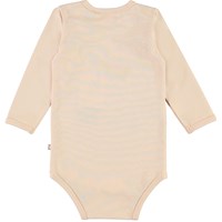 Foss is a long sleeve baby bodysuit in pink with a water lily print on the front. It has easy snap closure at the neck and crotch.