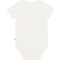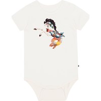 Short sleeve, white baby bodysuit in stretchy, organic cotton jersey. The bodysuit has a round neck, a white edge tape and an easy snap closure at the neck and between the legs. The bodysuit is in a colourful print on on the front of a fantastical carrousel horse