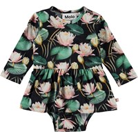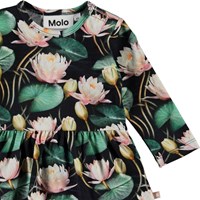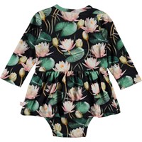 Frances is a long sleeve baby bodysuit with a print of pink water lilies. Frances has a peplum skirt and easy snap closure at one shoulder and at the crotch.