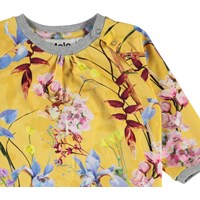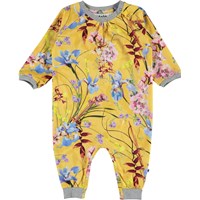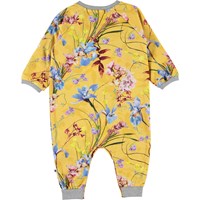 Francine is a baby romper in yellow with a floral print. Francine is roomy and has a slight drape at the neck. It has easy snap closure at the neck and crotch.