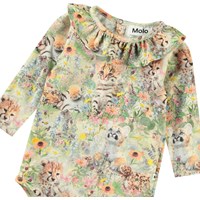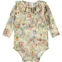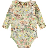Organic cotton bodysuit for the little ones. The bodysuit features long sleeves with ruffleed edges around the neck and cuffs. The button closure at the back and between the legs makes it easy to put on and take off. This bodysuit has a print of baby animals in a flower bed.