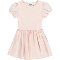 Pink dress for the little ones made of organic cotton. The top has a close-fit made of ribbed jersey with short, polin puff sleeves, and the attached poplin skirt has a nice volume.