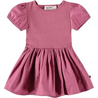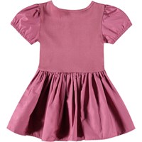 Pink dress for the little ones made of organic cotton. The dress has a snug-fitting top in ribbed jersey, a round neckline, short puff sleeves with elastic, and a round poplin skirt with gathers that add volume to the dress.