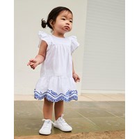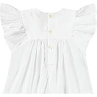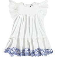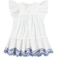 White dress for the little ones in organic cotton with delicate blue details. The dress features lovely ruffle sleeves, a skirt with broderie anglaise decoration at the bottom of the dress, and a button closure at the back, making it easy to put on and take off.