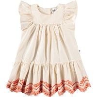White dress for the little ones made of organic cotton with fine orange embroidery details. The dress has ruffle sleeves, decorative embroidery, and button closure at the back for easy dressing and undressing.