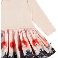 Candi is a baby dress in two parts with long sleeves. The top is in rose rib, while the skirt has a bunny print on a pink background.