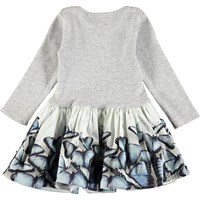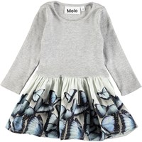 Sweet baby dress in a two-part look. The top is in grey rib and the skirt is a digital blue butterfly print.