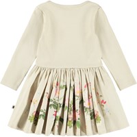 Long-sleeved dress for the little ones made of organic cotton. The dress is light green with a floral print. The top is slim-fitting in ribbed jersey, while the skirt is in poplin, which gives the dress volume. It is easy to put on and comfortable to wear.