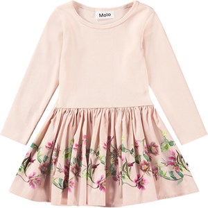Beige long-sleeved dress in organic cotton for the little ones. The top is snug-fitting in a ribbed jersey, while the skirt is made of poplin, which gives the dress volume. It is easy to put on and comfortable to wear. The dress's skirt has a print of pink and white Christmas roses.