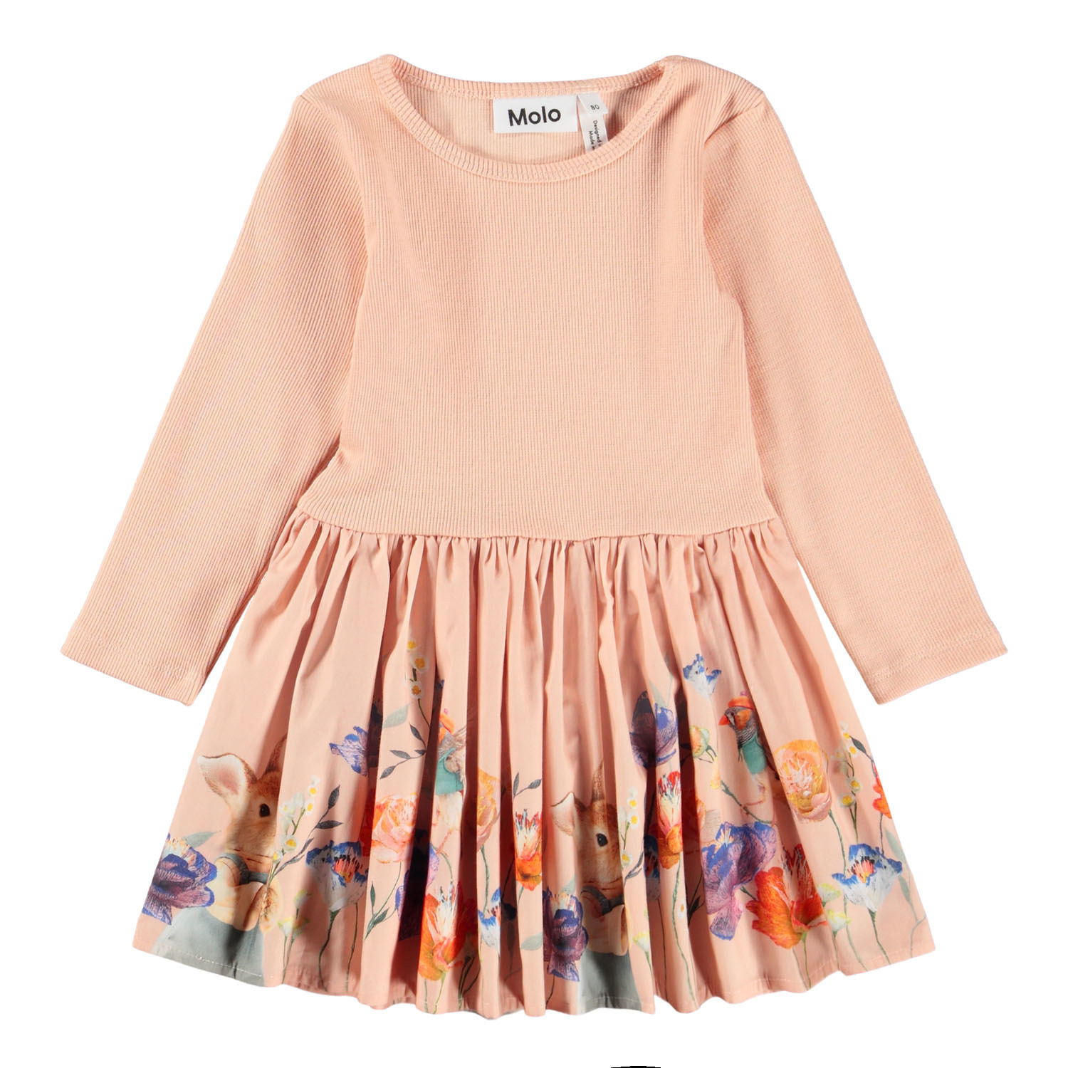 Long-sleeved dress for the little ones made of organic cotton. The dress is peach-coloured with a print of animals dressed in and flowers. The top is slim-fitting in ribbed jersey, while the skirt is in poplin, which gives the dress volume. It is easy to put on and comfortable to wear.