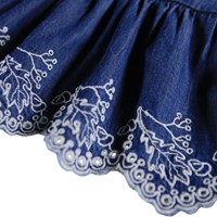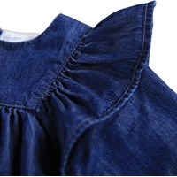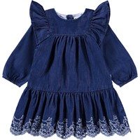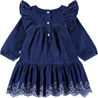 Dark blue dress for the little ones made of organic cotton chambray. The dress has a loose fit with ruffle details on the shoulders and an attached skirt. The skirt has beautiful broderie anglaise at the bottom. At the back, the dress has fine buttons in the middle, making it easy to put on.