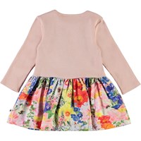 Carel is a baby dress in a two part look with long sleeves. The top is in rose coloured rib, and the skirt is in a print of various animals hiding in the flowers.