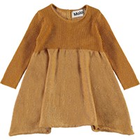 Cass is a knit baby dress in a golden colour. It has a rib top and a snap closure at the neck.