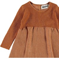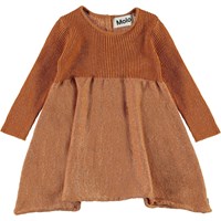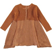 Cass is a golden bronze coloured baby knit dress. It has a snap closure at the neck.