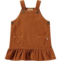 Brown smock dress made from soft organic cotton corduroy. The dress is loose-fitting with a small ruffle edge, adjustable straps, small sewn-on pockets, and snap buttons on the sides, making it easy to put on and take off.