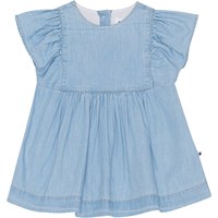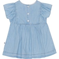Blue, organic dress for small children. It is in a loose fit, has a round neck and short, gathered sleeves. The dress has a button back closure.