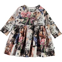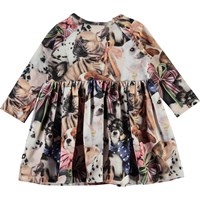 Charmaine is a baby dress with a print of small dogs that have ribbons around their necks. The dress has long sleeves and a lovely, full skirt.