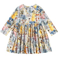 Long-sleeved dress for the little ones made of organic cotton. The dress is light blue and has a print of crocheted teddy bears. The top has snug raglan sleeves and a round neckline with a button closure at the back to make it easy to put on. The skirt has gathers that makes it ease to move and comfortable to wear.