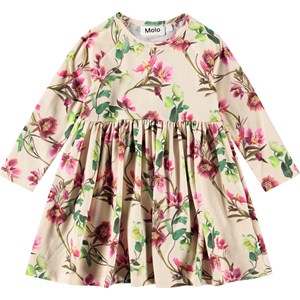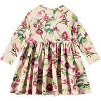 Beige jersey dress in organic cotton for the little ones. The dress has snug raglan sleeves and a round neckline with a popper behind the shoulder, making it easy to put on. It also has a skirt with gathers, allowing for movement and making it comfortable to wear. Additionally, the dress features an all-over print of Christmas roses in shades of pink and white.