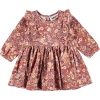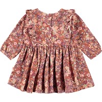 Chocho is a red baby dress with a print of small flowers. The dress has long sleeves and ruffles on the top as well as a zip closure at the neck.