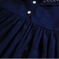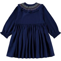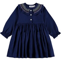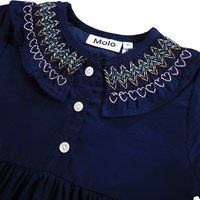 Long-sleeved dark blue dress made of viscose. The dress has colourful smock details at the collar and pretty ruffle edges at the sleeves. The dress has a nice button closure at the front and a finely gathered skirt.