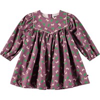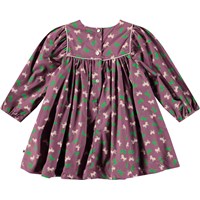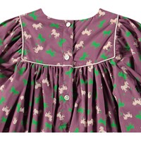 Poplin dresses in organic cotton for the little ones. The dress has a loose fit, high waist, balloon sleeves, round neckline, and button closure at the back. It is purple with a print of horses in green and beige, as well as trim details.