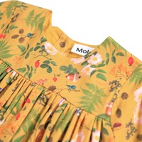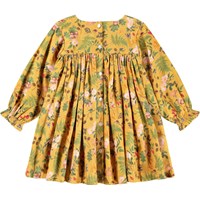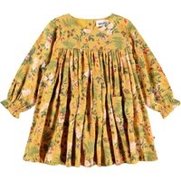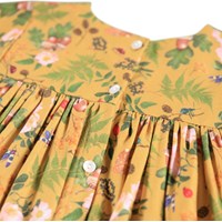 Yellow dress for the little ones made of viscose. The dress has a round neckline with small buttons on the back, to make it easy to put on. It has long sleeves with volume and a print of flowers, berries and insects.