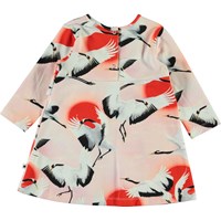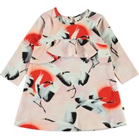 Coletta is a pink baby dress with a print of flying cranes. The dress has a ruffle over the chest with a snap closure at the neck.