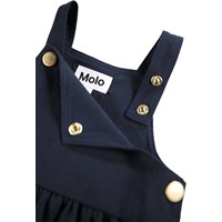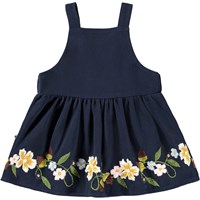 Dark blue pinafore dress made of soft, organic cotton with brass snap buttons on the straps and sides, as well as a fine, voluminous skirt. The dress has small, fine pockets at the front and it is easy to put on to make it practical and elegant. The skirt has a beautiful embroidery of flowers and nuts.