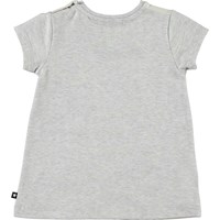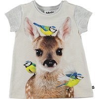Corina is a baby dress in a t-shirt shape. it is in light grey with a fawn and birds on the front. It has a snap closure on one shoulder.