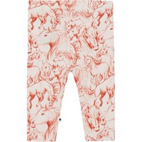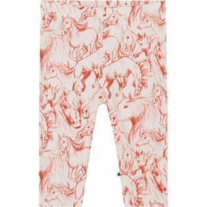 White, organic leggings, with a red print, for small children. The print is red sketches of horses. The elastic waist and soft fabric ensure a good fit.